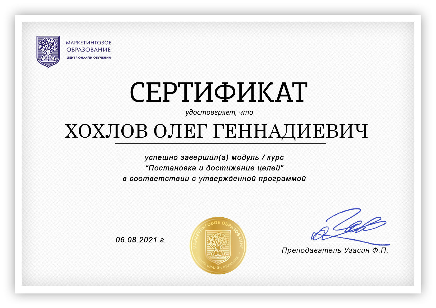 Образец свидетельства о прохождении курса